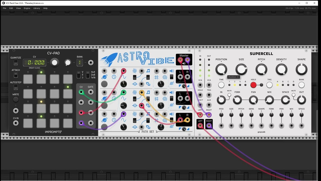 To kick things off I’m posting what I came up with, but it’s by no means tapping into all the potential of this really inspiring module, so I thought it would be fun to see more of what others can do with it. This is not a contest or competition or anything; there is no judging and the only “rule” is to use at most 3 modules (excluding audio/recorder modules), with at least one of the modules being AstroVibe. Hoping that limitations can breed creativity for you, have fun!
