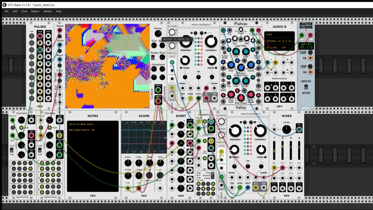 The CyclicCA module is a Cyclic Cellular Automata simulator that can be used both as a visulization tool to accompain the music (and fill rack “holes” and as a pseudo-random CV generator that is connected to the current state of the cells of the automaton.