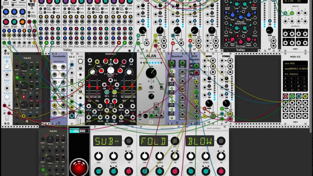 C minor with inversions and a simple 3-chord sequence, plus a gently off-beat kick and hi-hats courtesy a couple of Bernoulli filters. Patch: Galactose.vcv (38.7 KB)