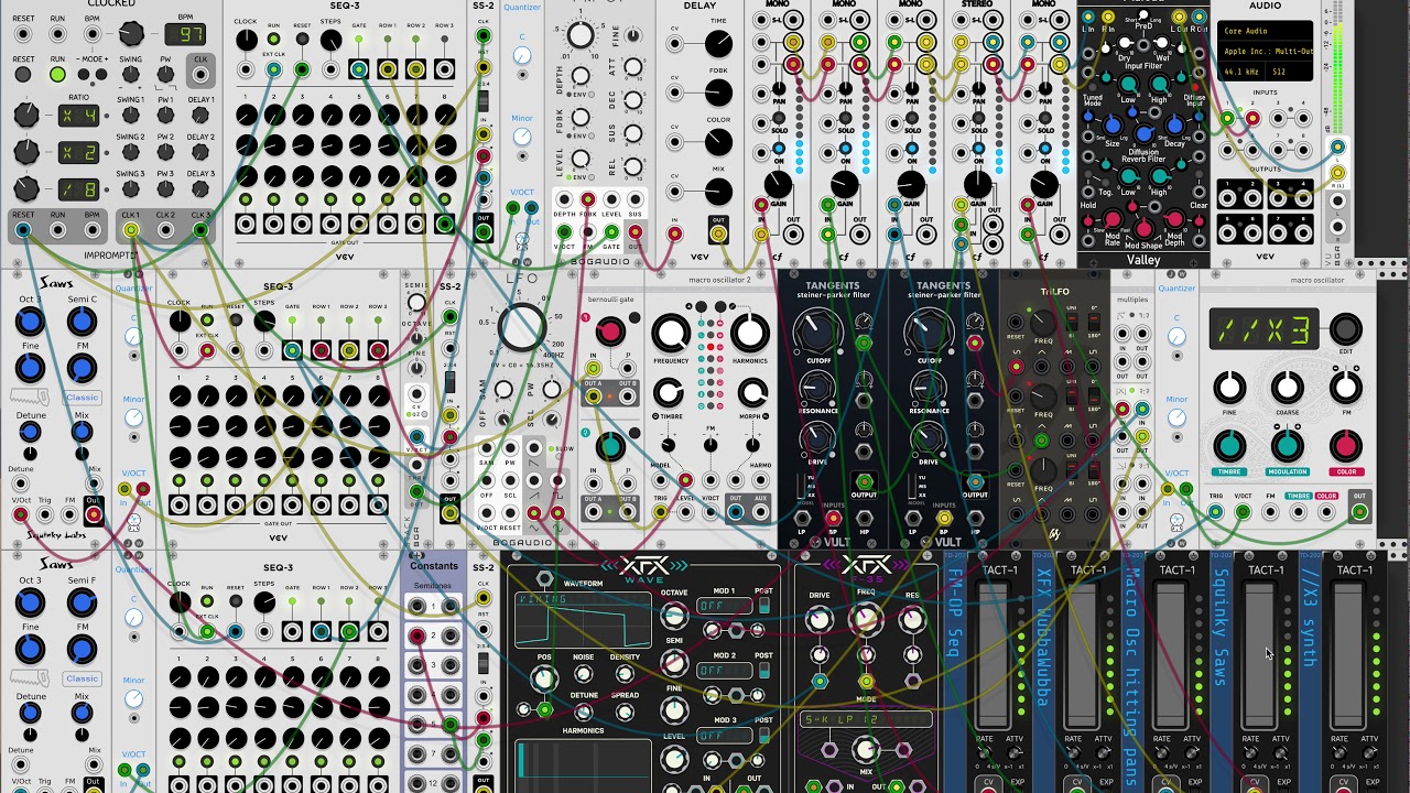 This is a sequencer fest, 3 running at 8,7 & 6 steps, 8 separate sequence lines running out into 5 sound generators, Seq-2 switches feeding in and out the different voicing as the melodies intertwine. Did someone say wine?