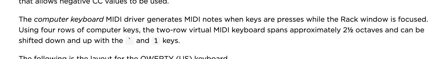 I switched to different keyboard layouts in the preferences of my MacBook but that did not change the layout of the “keyboard as midi input” in VCV. So regardless what keyboard layout is physically on your MacBook and what settings you have selected as keyboard layout within your OS. The laptop midi layout stays on US-QWERTY.