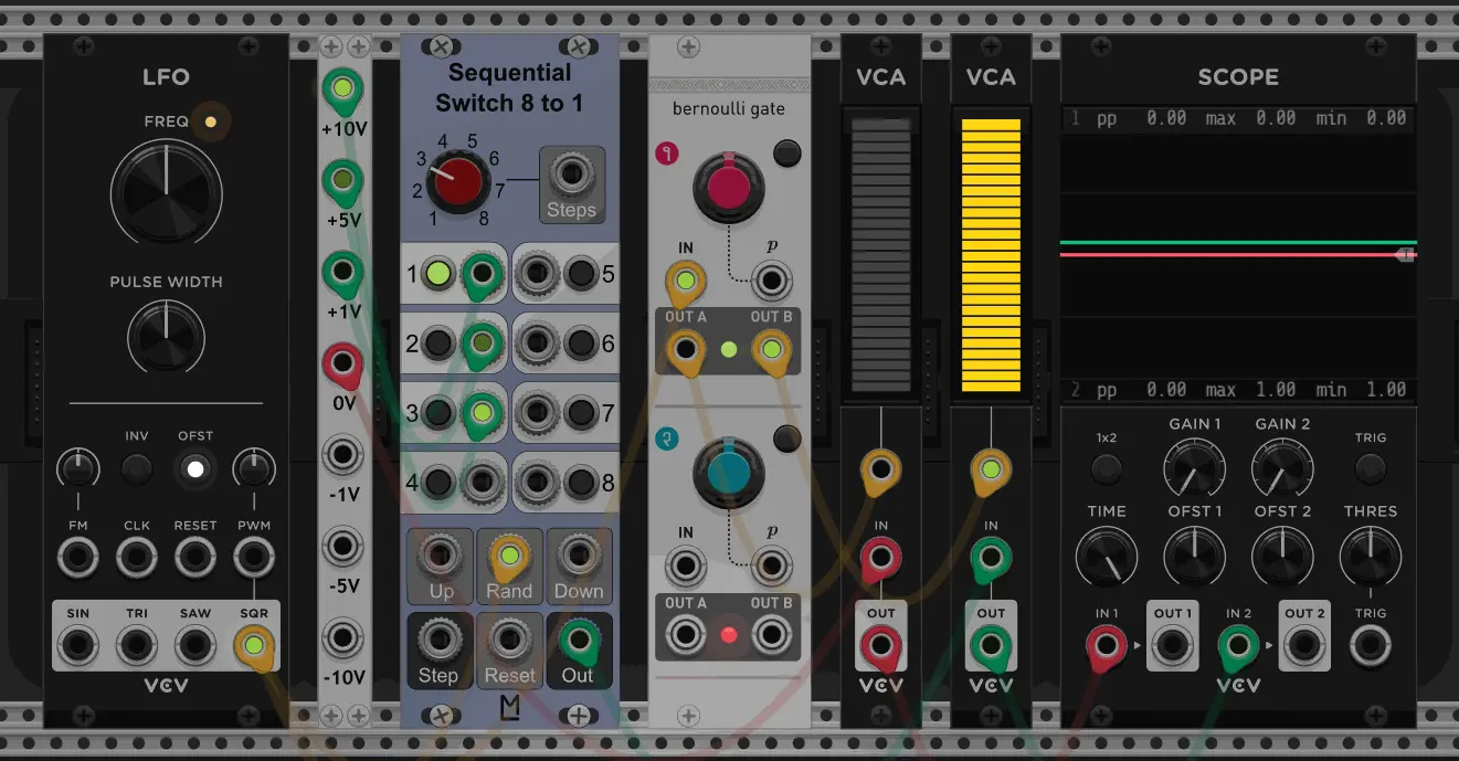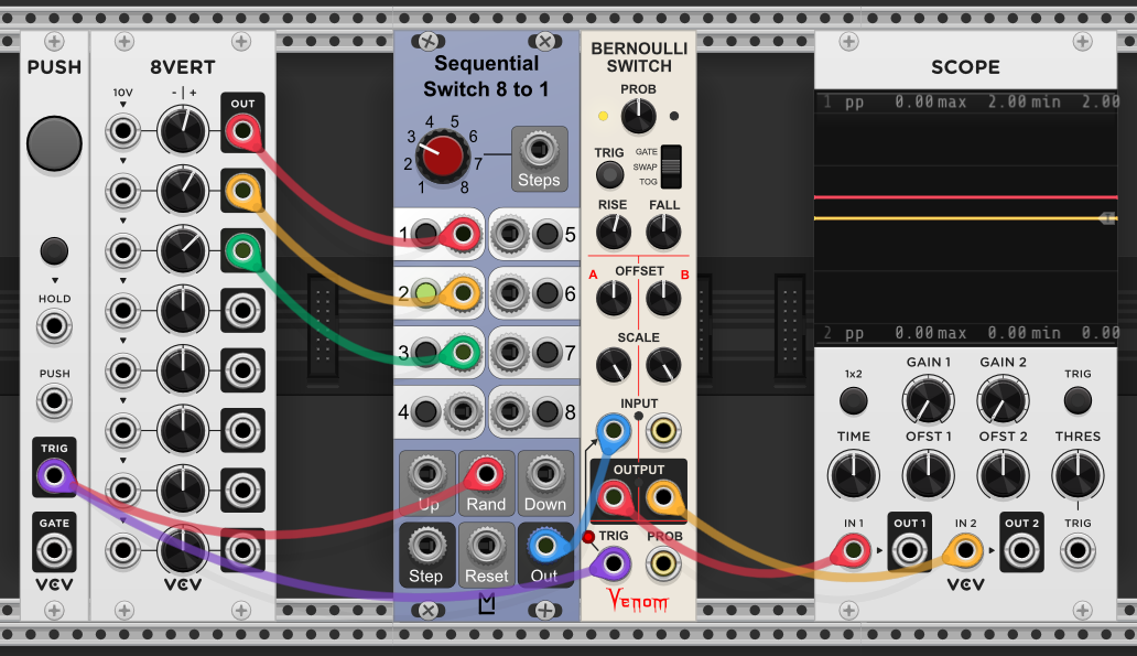 A simple thing but I can’t get it… A sequence of gates to a bernoulli gate that should switch between a fixed 0V value on out 1 and a random of 3 fixed CV values on out 2