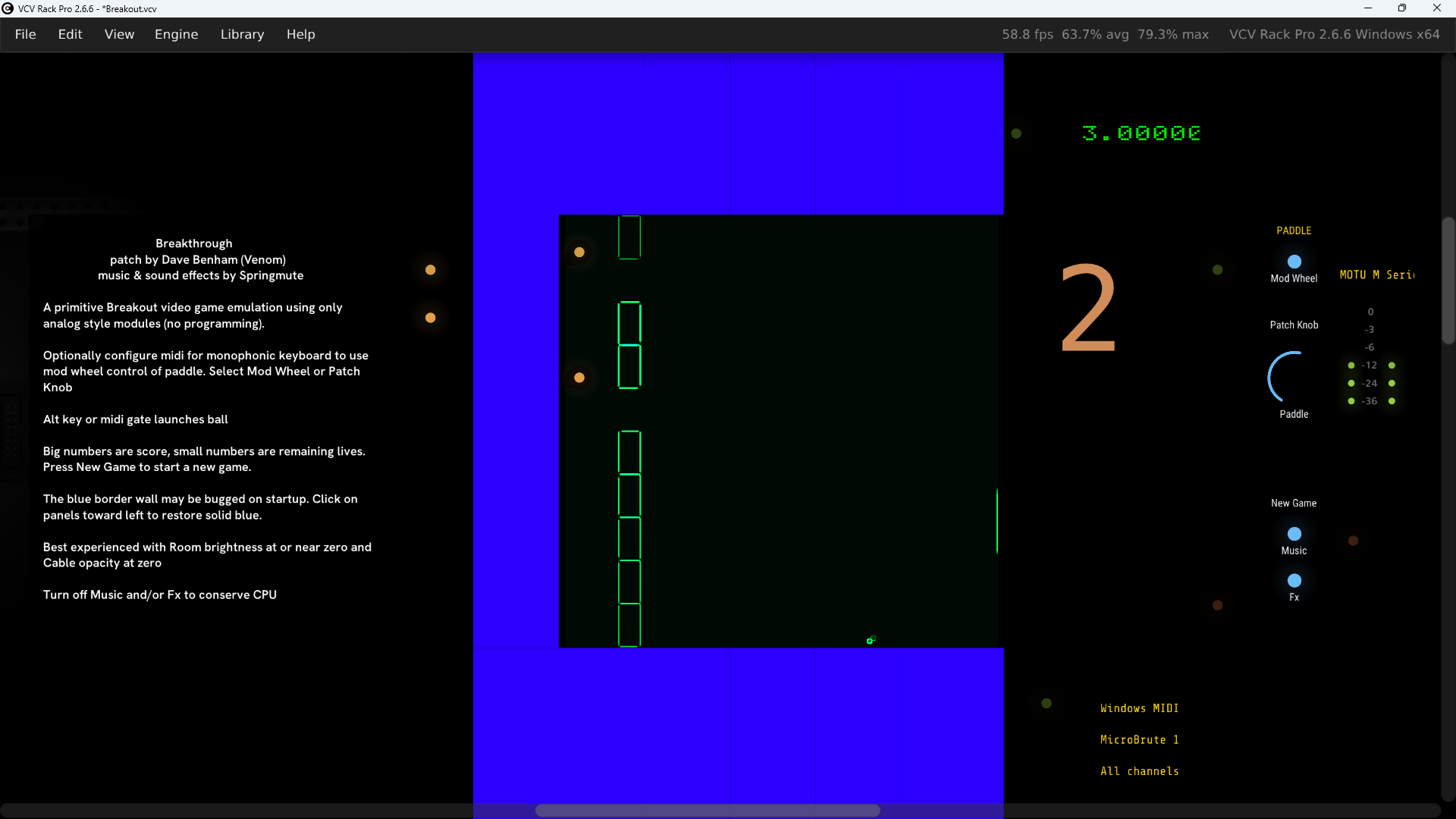 I was inspired by Springmute’s VCV patch on Patchstorage that emulated Atari Pong in single player mode. I decided to take a stab at creating an emulation of Atari Breakout. It is very primitive