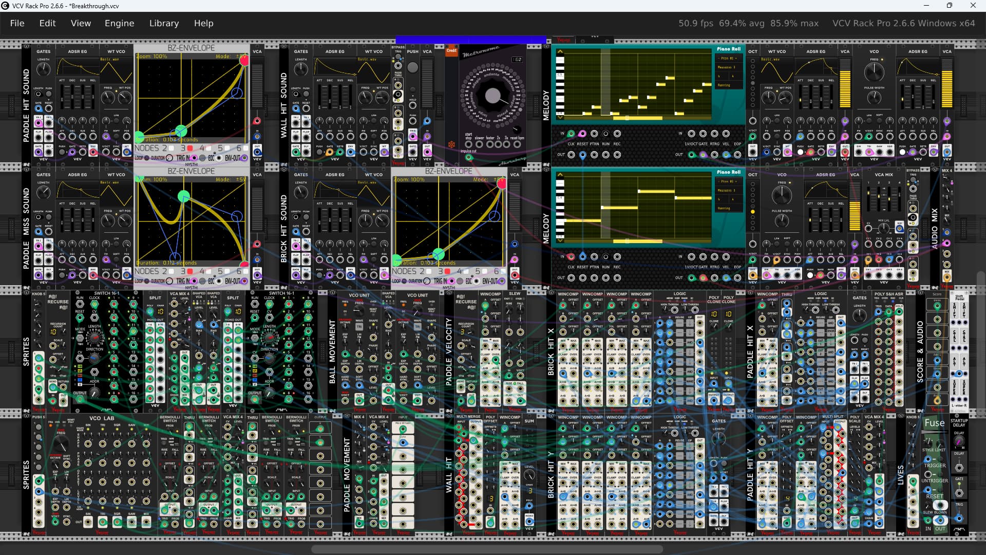 I liked Springmute’s music and sound effects, so I reused that portion of his patch in Breakthrough. Everything else I created from scratch using mostly Venom modules. I felt it was important to use only analog style modules. No programming modules were used.