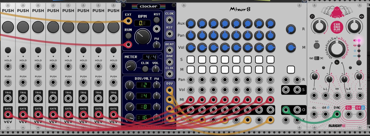 I have a Novation Launchpad X (“LPX”) and would like to set it up inside rack to control some sort of delay where the horizontal rows of the LPX output as shown below. I know I will need to figure out how to make the rows ‘exclusive’ (solo priority from right to left), but my current mystery is how to create a changing clock subdivision, based on the top two rows. The second image below shows my initial thoughts, (Push buttons are DAW-Learned from the LPX). This seems to create a tap-tempo type of clock where it takes a few pulses before a clock is created, and even then syncopations between the different divisions prevent an accurate bpm.