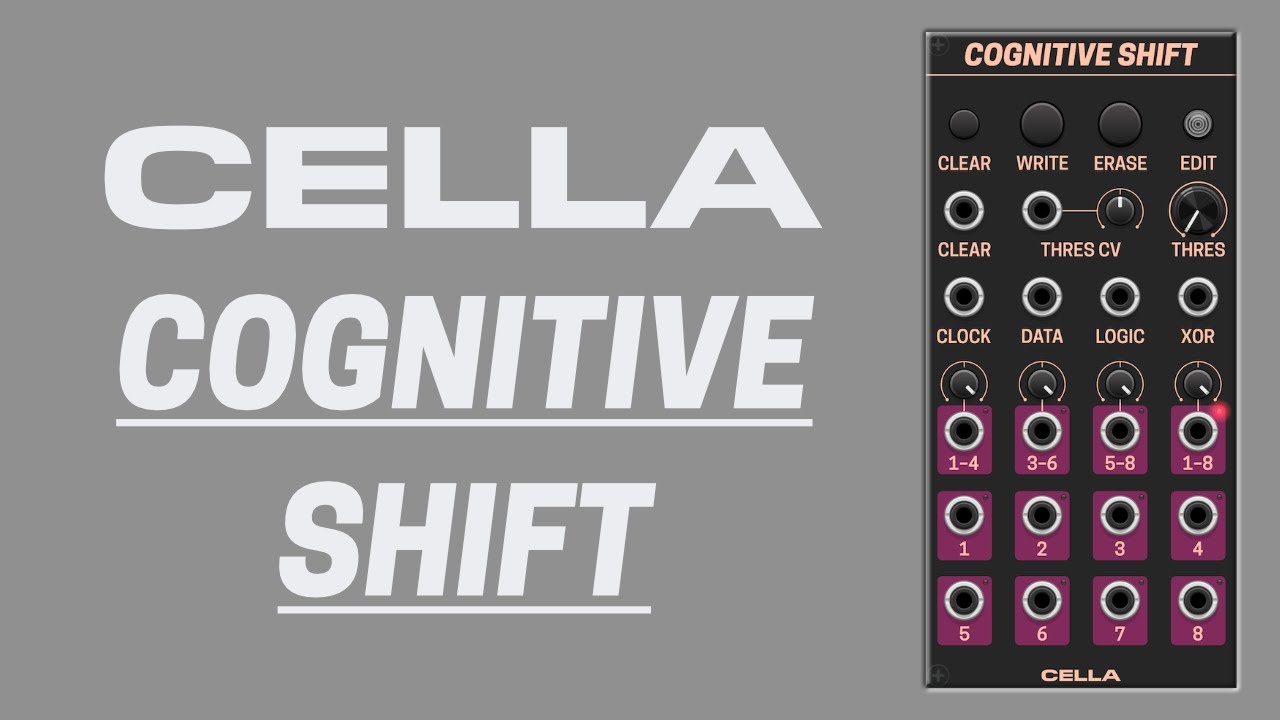 Cognitive Shift is an advanced 8-bit digital shift register module. It incorporates flexible input logic (XOR and selectable logic operations), manual data overrides, data edit mode, three overlapping unipolar 4-bit DAC outputs, a bipolar/unipolar 8-bit DAC output, individual bits outputs, input signal threshold and configurable output modes. It also features intelligent handling of self- and cross-patching to allow for complex feedback patterns.