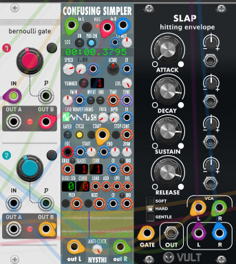 The Bernoulli gate input comes from to the clock of your choice, I generally use a 1/16 note clock, but anything will do. You can use the triggers from a sequencer, and have stutters whose duration is tied to the rhythm being played.