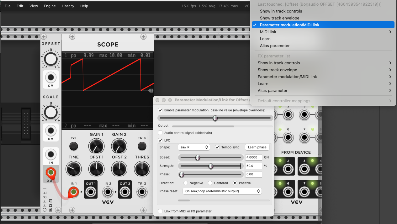 I am! That screenshot is of reaper. The menu top right with “last touched Bogaudio…” is the parameter menu in Reaper. Press the menu that’s highlighted in the screenshot and it brings up the param modulation window that you see in front there (for said last touched param). Then set it up exactly as shown and the parameter will do the repeatedly rising phasor thing, as you can see on the scope. ![]()