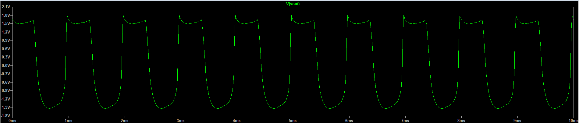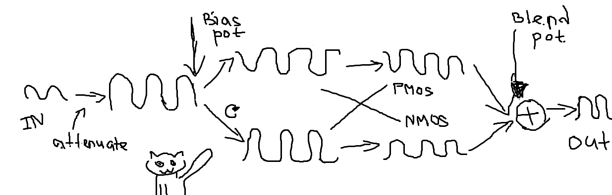 I think it’s self-explanatory, but I will explain some things that are not obvious. the upper row after the split is NMOS1 → PMOS path and the one under it is PMOS1 → NMOS. Both PMOS1 and NMOS1 squish a sine against the nonlinear region and the following NMOS and PMOS are either to make the squishing more pronounced or, when the signal is mostly clean, to just add some class a amp distortion. Blending after that is passive, it averages the signals, on my scope, a real one, the summing looks a lot like crossover distortion. But the opamp output is fine and doesn’t have a crossover knee. I don’t know what’s up with this. Probably some science is happening. With biasing we can move the signal along the curve, so… I think as you push the biasing towards the ground, the output sound becomes more distorted and compressed. While if you lower the resistance to the V+, it makes it louder, less compressed, but also more bassy/mid-lows, as more second harmonic enrichment is happening to the lower guitar strings. Now, with guitar it’s not very throat-singie-ish. There are some harmonics that pop up, but it sounds just like a booster pedal or something. The signal is too low as it is, and if you push it with the input opamp, it just distorts heavily, and the distortion is not nice, it’s very bassy again, muddy. BUT if you just push it and put an overdrive after that - that’s great. It becomes a very rich distortion effect. I wouldn’t compare it to a tube amp, but it’s interesting and it’s not just clipping, you know, it feels more than that. I will rethink the input section though, I think I already mentioned that. One of the things that might be responsible for “whistling” harmonics is a safety mechanism in CD4007. It make the second PMOS “fold” the positive pole when it goes higher than the 14th pin. It quite interesting, actually. I was afraid that it would just burn the chip, but instead it does this. Funny! I’ll show you how it looks in LTSpice. The real scope shows something similar. Not 1-to-1, but similar…