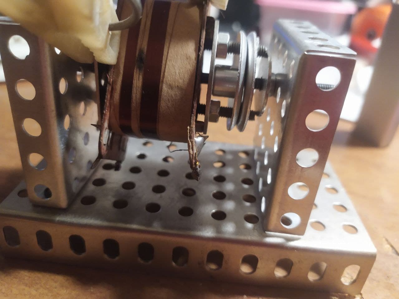Well, it is great that it worked, but there were lots of troubles. And while troubleshooting I used my tube amp. And I destroyed it. Haha. I blew up my output transformer somehow. It’s not hard to buy a new one. But I decided to fix it maybe. It’s like 2700 turns of 0.1mm wire for the primary, but oh well. So I unwinded… unwounded? The secondary and here it is, the burn mark.
