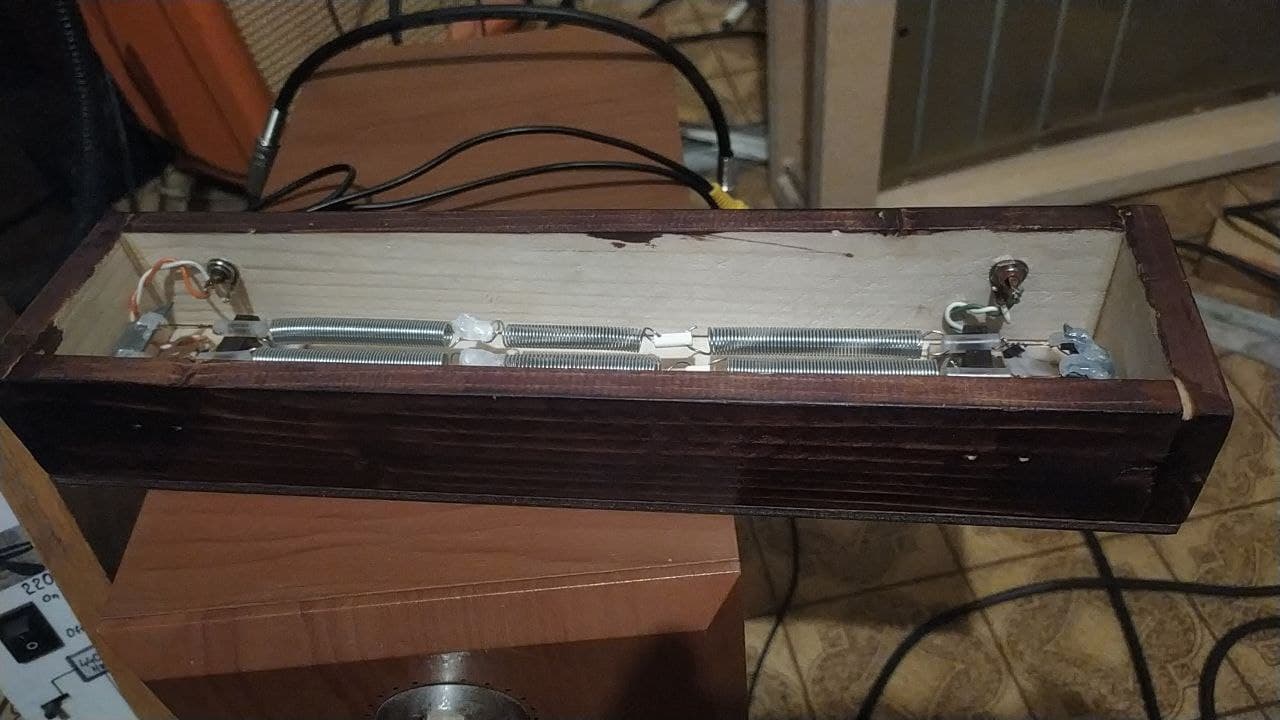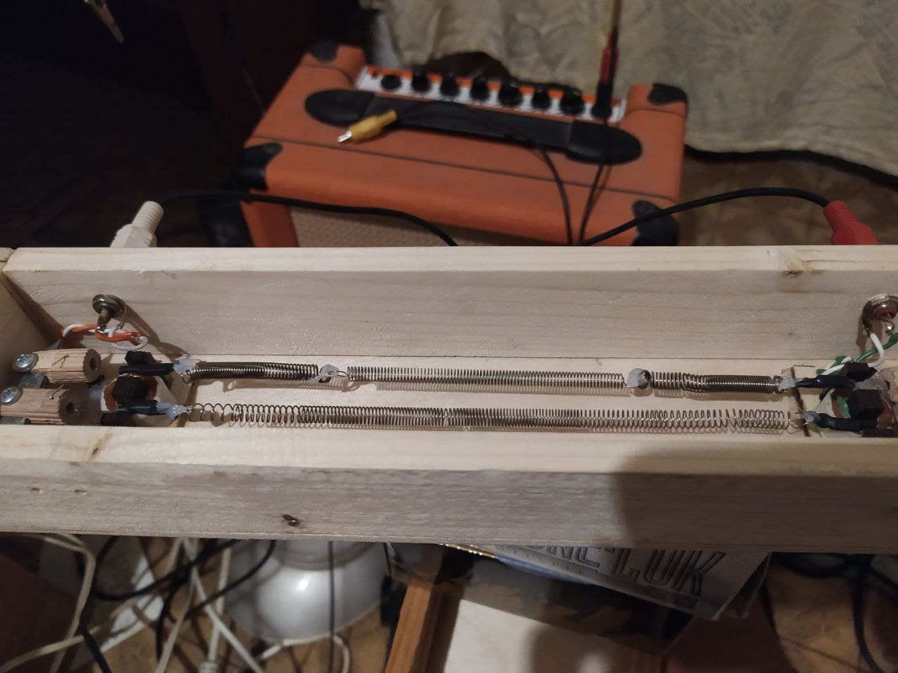 On october/november I made a box. It was a great box! “Wow,” - i though, - “I made a box”. About a month or two before that in my local DIY electronics store I saw an owner just destroying dismantling small transformers with laminated cores. I asked if I can have the cores, and he said that they were about to throw them away anyway. “Wow,” - i though, - “I bought the laminated core plates”. So I made another box, this time I was keeping in mind the idea of making a spring tank. And I made it, it was even better than the last box. Objectively it’s like 4/10 woodwork, but I was proud! Then I wound…winded? I made a receiver coil using a 0.1mm wire, which was an actual bottleneck of a project, meaning if I can’t make it, there’s no point. I can make a transducer, I know that, it’s not hard to make a magnet go “boing~”. Receiver though is… at least in my mind it was much more delicate, I guess. Maybe I am wrong. But I made it and I checked it with my oscilloscope to see if it actually works. And it does, I was plucking a string with a magnet attached to it and I saw a very strong signal on the scope. Not just 1mV or whatever, but something like 30-50mV. So I quickly made a transducer coil and waxed it all, just for funs. And mounted it into my box. I used old heater NiCr springs for testing (y…y-yeah, not that I hoped they would work and I wouldn’t have to buy springs…). And here, look