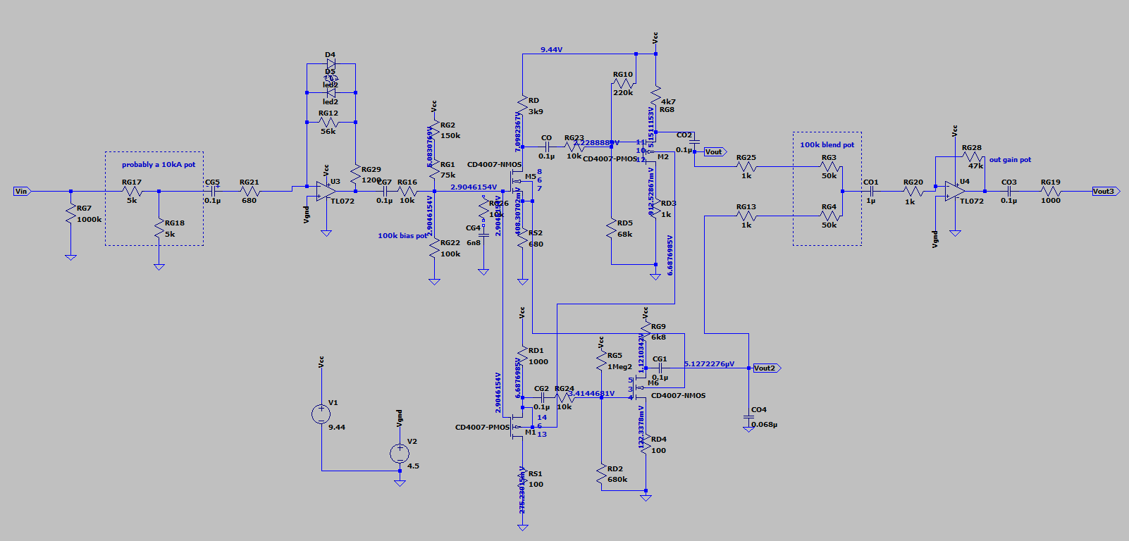 I hope it’s not too compressed. Anyway, V+ here is 9.44v, because I was comparing the numbers with my actual breadboarded circuit. I will redo the gain staging, probably. It is a guitar pedal as of now, but I will make a modular version later, because while playing with it, I discovered that it is an interesting waveshaper. With hot 5v signals and 9.44V headroom on some settings it produces a throat singing effect. I am not kidding. Like full on Sygyt (you can hear the ACTUAL Sygyt here, for example, the whistling high notes). I am not quite sure how easy it is to reproduce though. Cause maybe that was just one of the MOSFETs catching oscillation. That would be embarrassing. Anyway, so formants and waveshaping aside, let me tell you what it actually does as an effect (spoiler: it wasn’t supposed to be an effect)