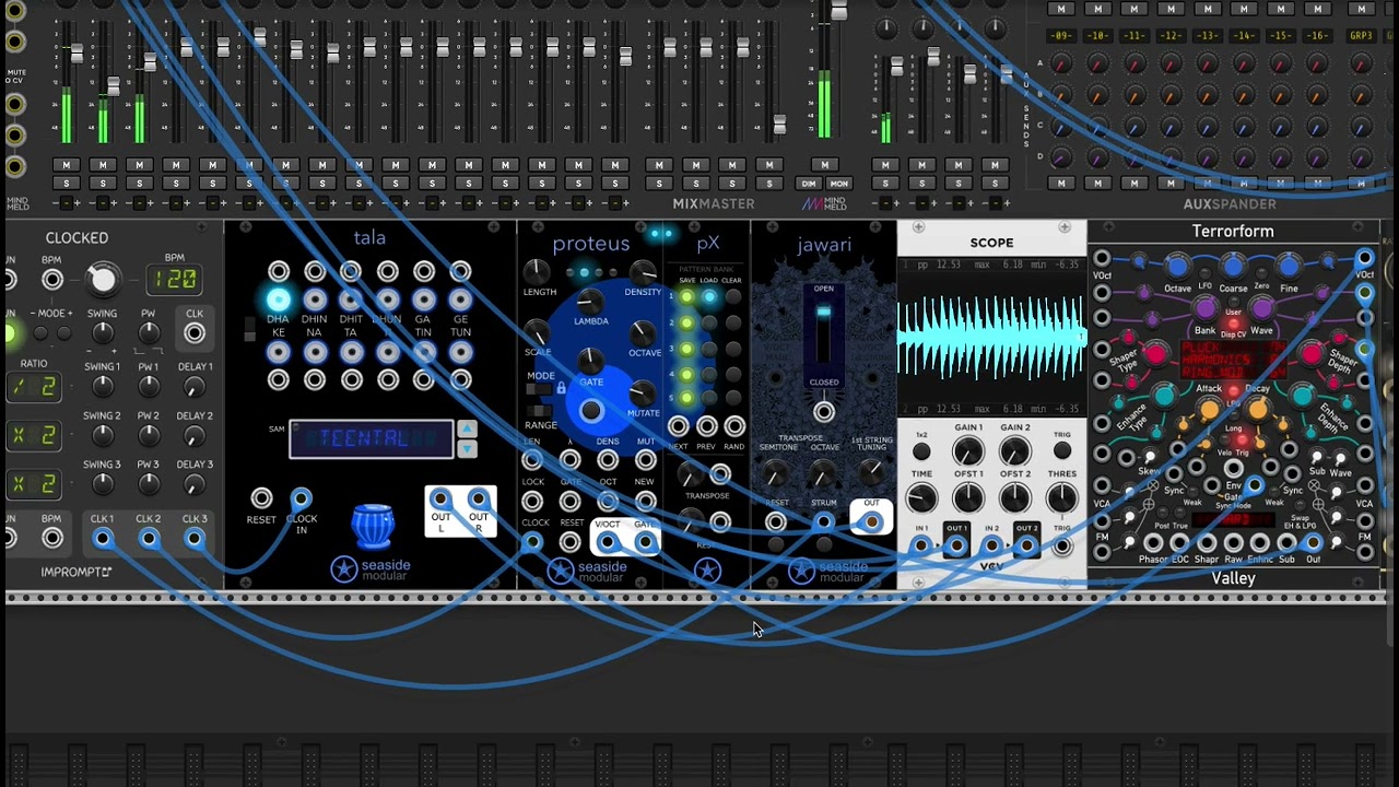 For this patch, I am creating a tabla drum track using 2 Ohmer Modules QuadPercs modules set up to use the free LinnDrum conga samples. The drum polyrhythm is created using the Sckitam MarokovSeq and the Meander clocked trigger outs. Also in the patch is the Seaside Modular Jawari module.