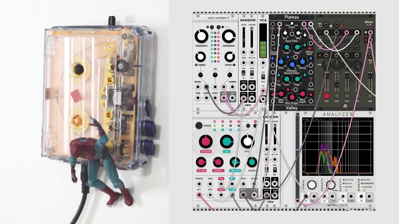 Cassette tape loops processed to walkman mod to granular audio processor, blend with macro oscillator organ generative sounds in VCV Rack
