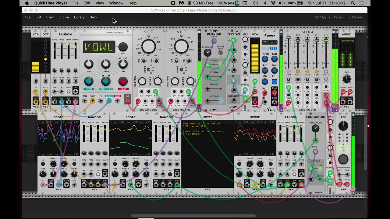 Oh. It just occurred to me that when I say in the “Notes” module how to change the voice from male to female, I say to change a setting of VCF, but there are two of them in the patch, and I forgot which one it was. Then I looked at the video and it doesn’t appear that I change either VCF much at all, only the OCT module by 1 octave.