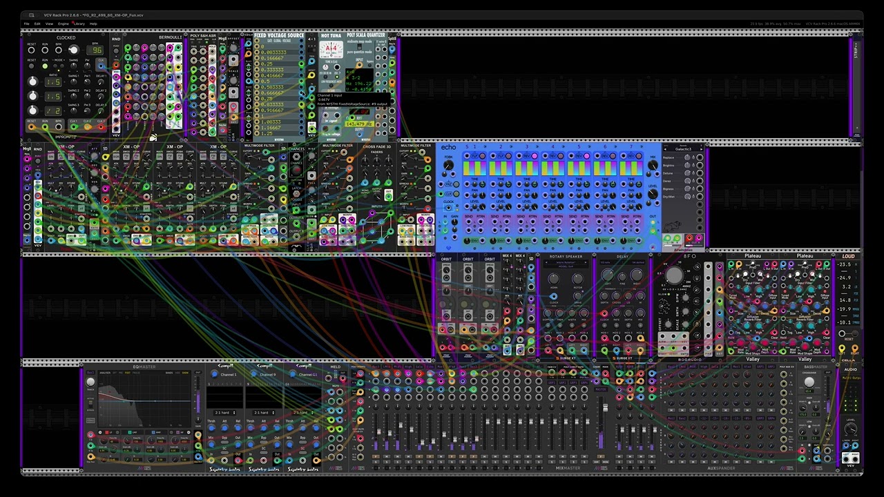 This is 4 XM-OPs, 3 Multimode filters and a crossfade 3D from @DaveBenhamMusic which are slowly invading my patches. Also the most excellent Echo from @CosineKitty and of course run that through a Airwindows Galactic 3 reverb at 75% size and 0.7 of detune. This is 100% VCV Rack, no DAW involved. Headphones, or a good low end producing set of speakers recommended