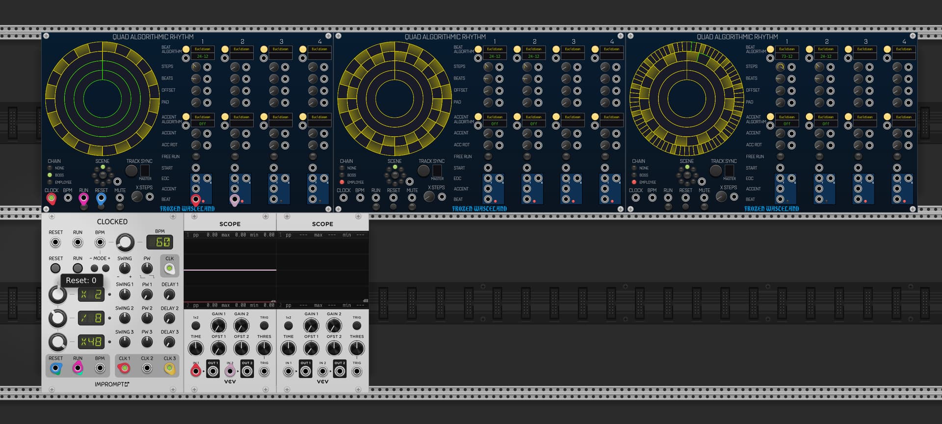 Nope. Reset from Clocked only resets the track that is currently playing… So if track 1 on the 3rd module in the chain is playing, that’s the track that gets reset. If track 2 on the 2nd module in the chain is playing, that’s the track that gets reset.