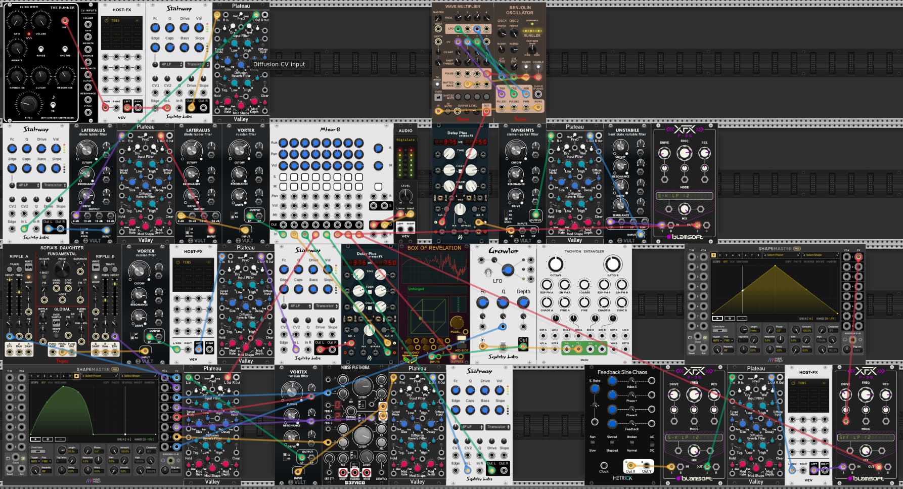The drums are various samples played from Nysthi QuadSimpler going into various chains, 4ms Pitch Shift was used frequently. Also used Valley Plateau frequently, and Vult’s filters are always my first choice (along with SquinkyLabs Stairway). Entrian Drummer was used for drum sequencing.