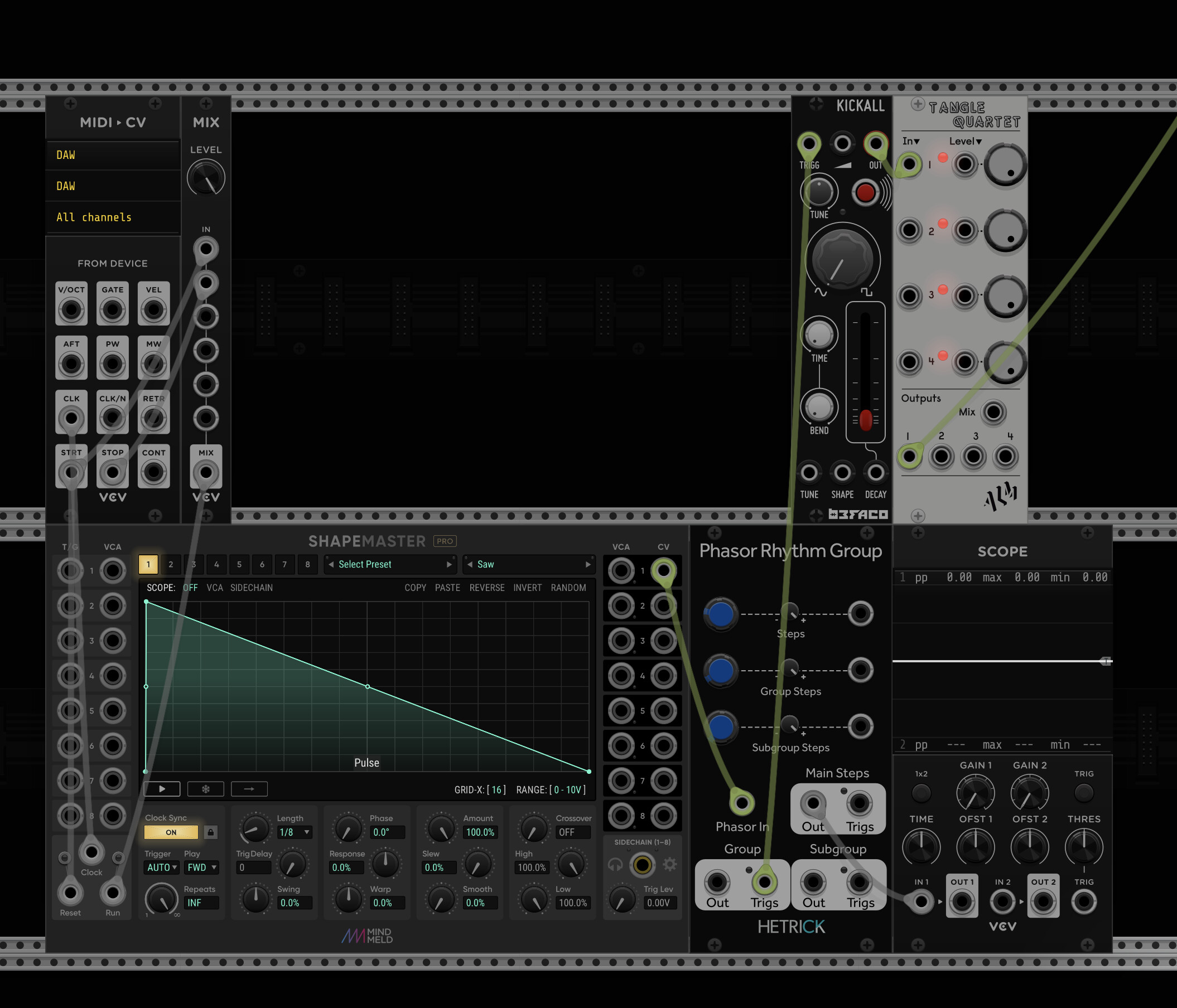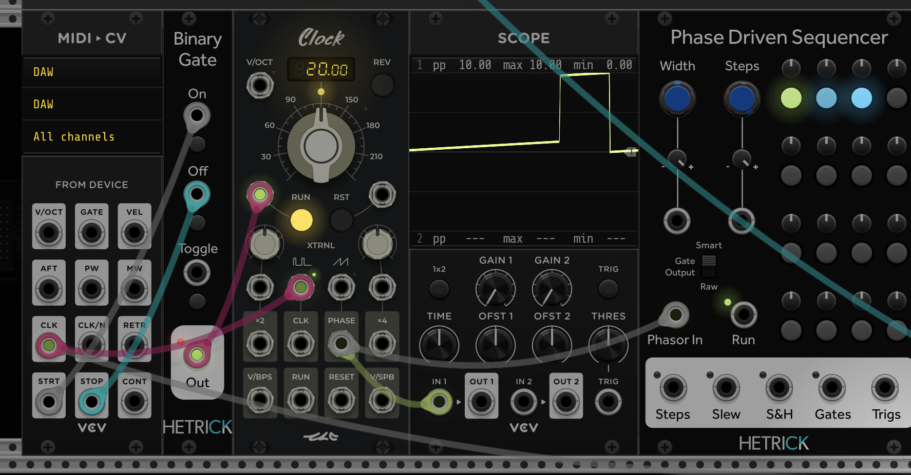 I wish there was a phasor coming directly out of the 1st module instead of having to convert it from a pulse. I actually tried an experiment of sending a phasor/saw directly from Ableton into VCV Rack using CV Tools. It worked but I had to do some patching that didn’t feel as clean. I couldn’t get it to send from 1/2 only 3/4 5/6 7/8 and I’d have to send a phasor into each. I felt like there was potential for some latency as well. But it might have worked just as well too.