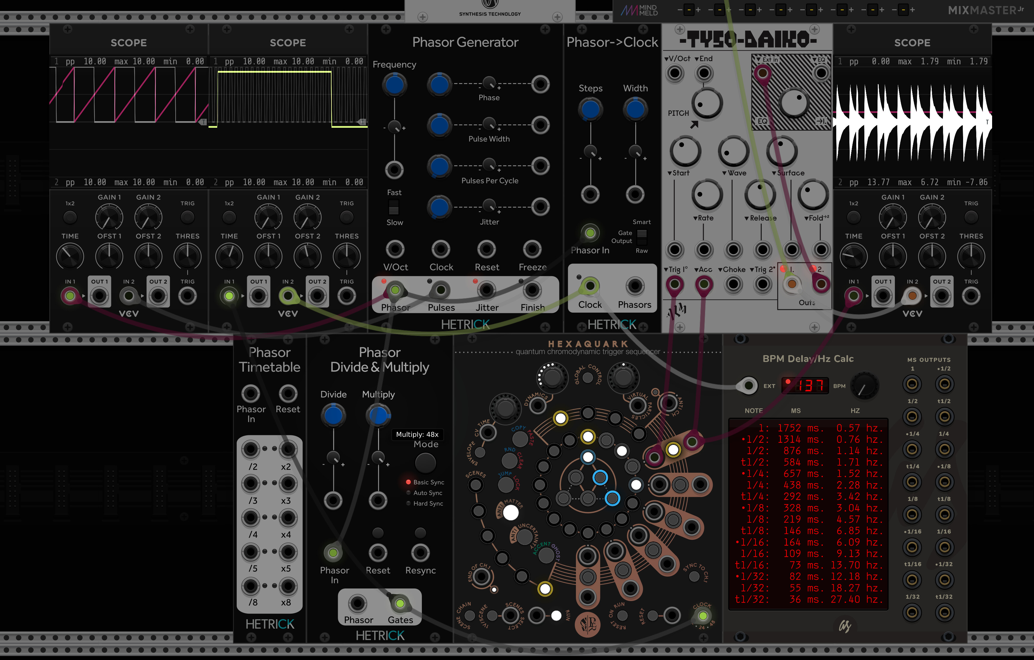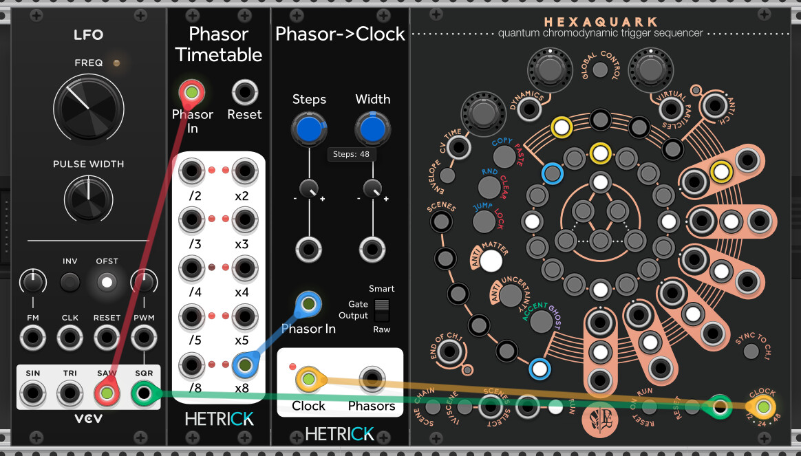 To get one cycle of the phasor to scan all 16 steps of the Hexaquark, you’ll want to break each phasor into 48*8 pulses. You can use the Div/Mult module and set Multiply to 48 and Divide to 0.125. I like to use the Timetable whenever possible, so I’m doing that here and attaching the LFO’s SQR output to the Hexaquark Reset input to make sure that the Hexaquark is in phase with the phasor.