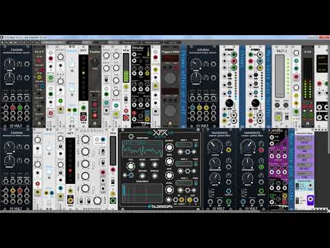 Blamsoft XFX Wave feeds a dual Tangent filter pair to create both a repeating wave of thick deep notes and ghostly sprite like shrill notes. This feeds Southpole Parasites in time stretch mode for reverb and fill. The other half is AS Tiny Sine fed by random notes and sent to Southpole Parasites Smoke to create chimes with reverb and additional effects. Three instances of Vult Caudal provides all of the control CV and triggers for the patch.
