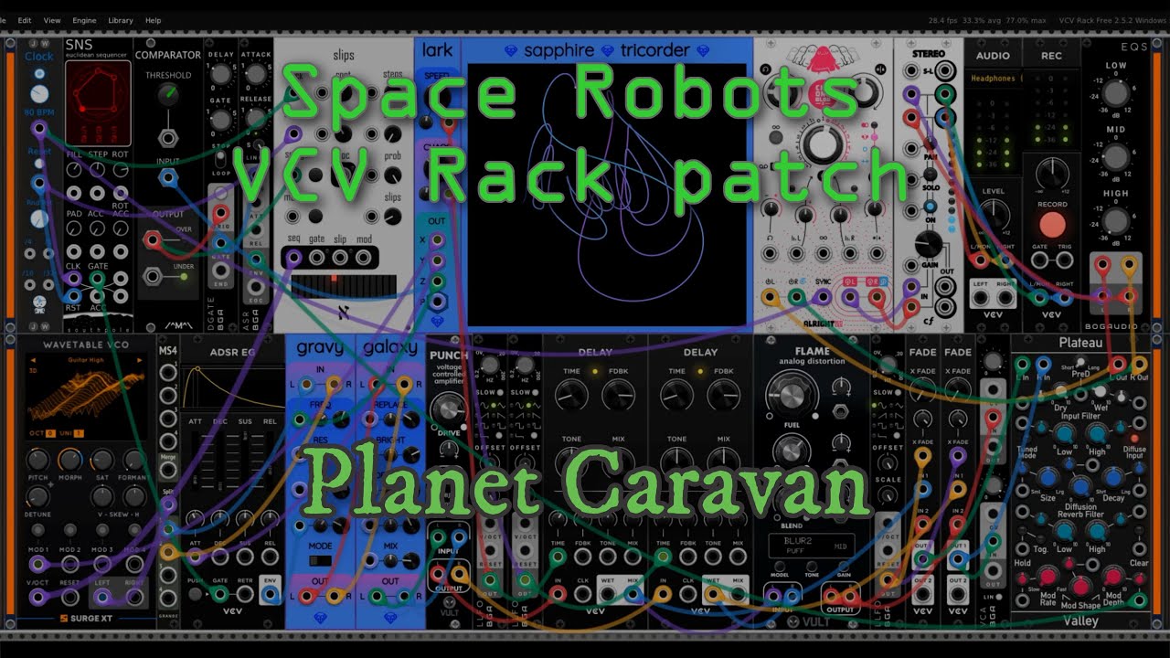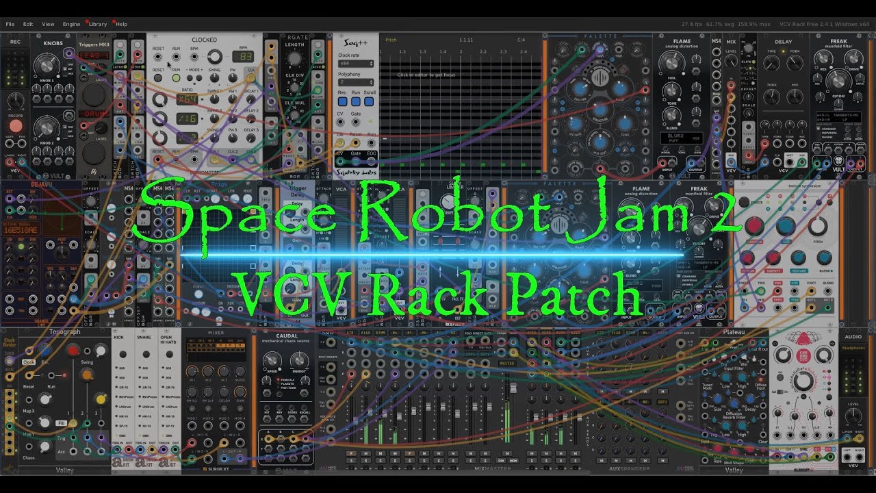 This is a redo of an older patch. I changed the lead into a more structured routine, and added some subtle drums. Three space robots walked into a bar and started playing this. This is a slow but groovy rhythm using Palette, a clone of Mutable Instruments Plaits for the guitar voices. Vult Flame adds the Marshall stack character. VCV Delay and an LFO creates a killer reel flanging effect. Squinky Labs Seq++ provides the backing rhythm, and Orange Line DeJavu creates the lead gates and notes. Robot sounds created by Clouds in Pitch shifter / Time stretcher mode. This soundscape will be used for a stop motion animated video featuring the Space Robots from Outer Space!