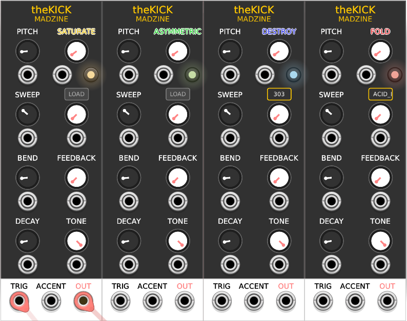 theKICK: Analog kick drum synthesizer (8HP). Features exponential pitch sweep with adjustable sweep amount and bend curve, tanh saturate, WAV sample FM, feedback FM, tone LPF, and accent input. Supports WAV file loading via right-click menu for sample-based pitch modulation.