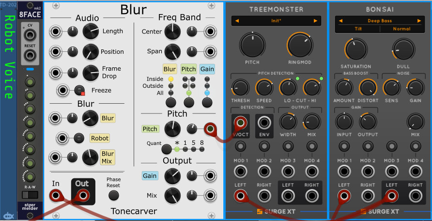 So here is one option I came up with–and yes I searched for Vocoder…but then I just searched for “Robot” and found ToneCarver’s module. With a few effects–I can get a responsive voice with a lot of options to play with. And the “freeze” button is kinda fun to make it sound like the robot’s brain is glitching (just like mine does!):