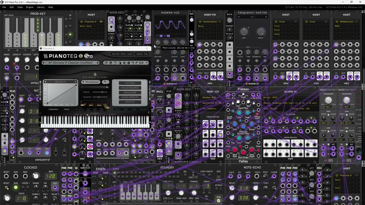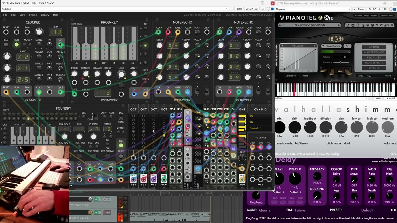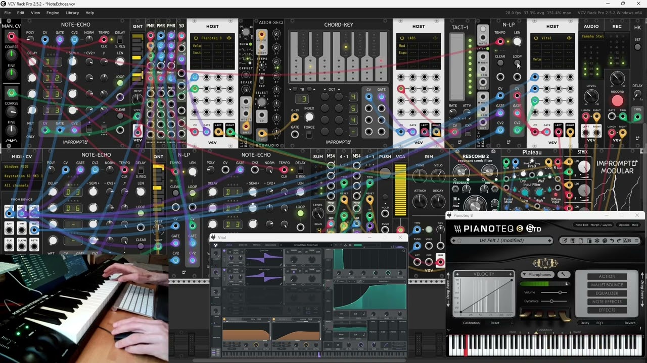 Another hybridization project between VCV Rack and Modartt Pianoteq, mixing ostinatos and delays, over a subtle canvas of shimmer reverb and choir.