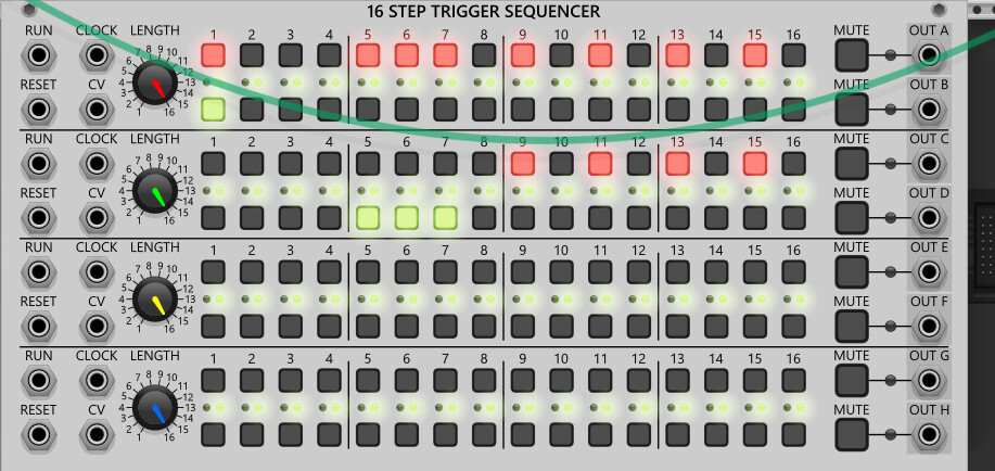 I was thinking first row trigger the pitches in the sequencer, second row triggers the longest duration gate+envelope, third row triggers middle length gate+envelope and fourth row shortest duration