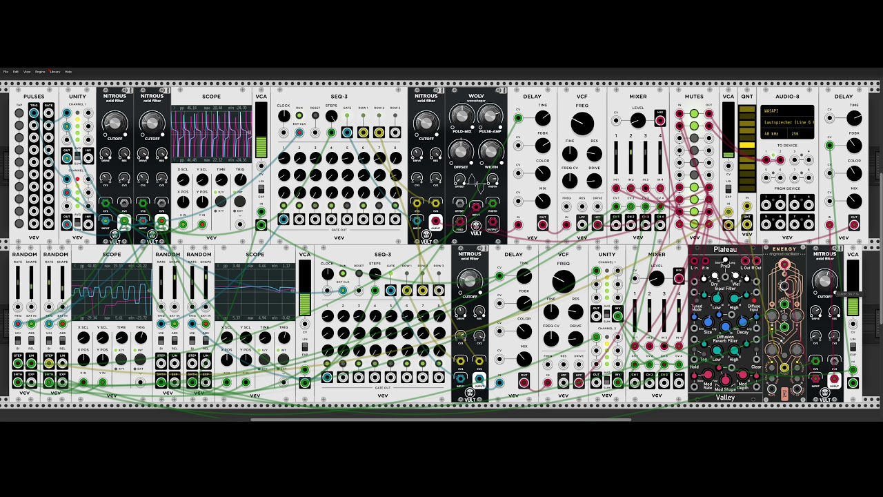 I wanted to get out as much as possible from those two nitroclocks, so the first pair of S&H (VCV Random - botton left) is sampling the waveform of one nitrous, while triggered by the other one. I use those modulation for different things all over the place, one output goes to a quantizer and then as V/Oct to the Geodesics Energy. The second pair of S&H is used for a slower and more slewed modulation, which is among other things modulating the speed of the nitroclocks.