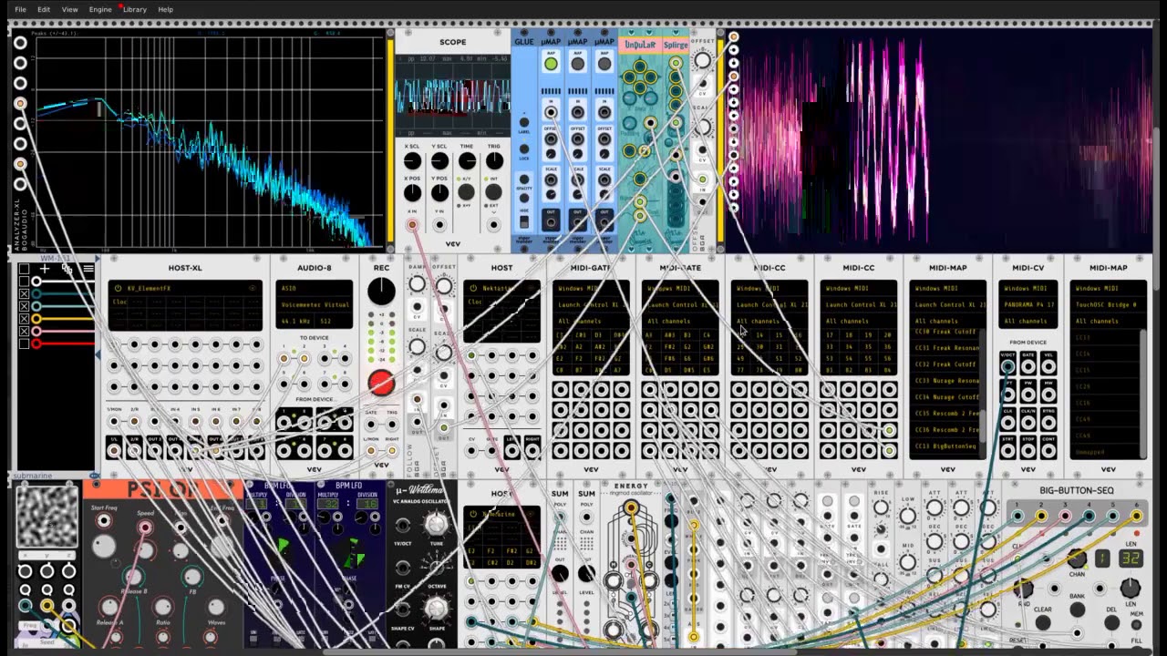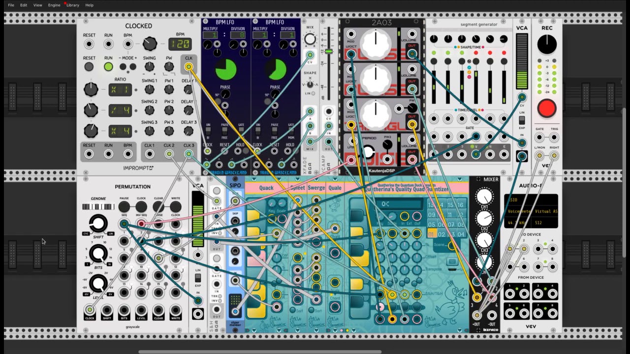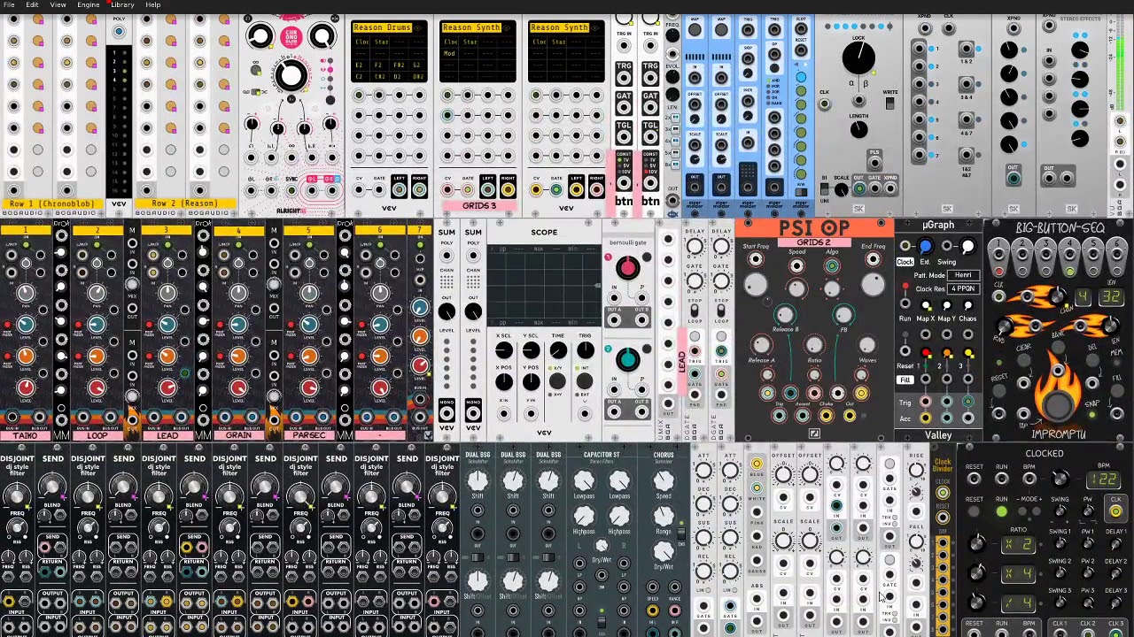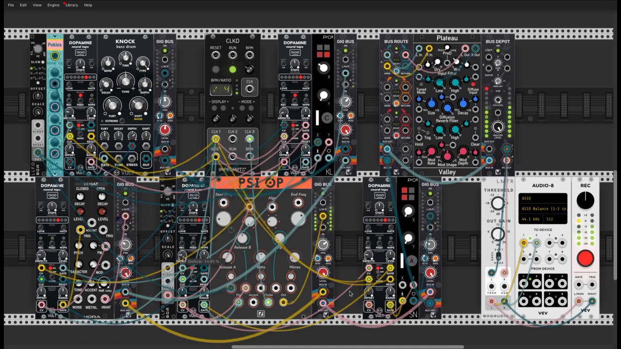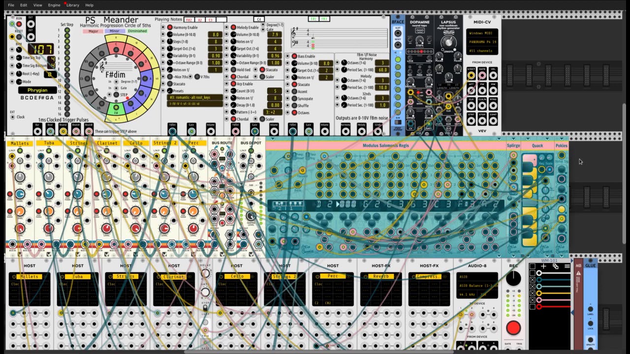 The mallets melody is improvised on a keyboard once, then Dopamine takes over. Definitely a module that should see more use (I guess its being part of a paid plugin being branded as experimental means few have it). A lot of the logic lives within the Reason instances (not pictured) on this one.