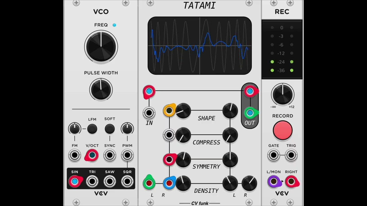 Tatami is a stereo polyphonic wave shape and wave folding module. SHAPE smoothly morphs from a saturation effect through 2 different sine-wavefolding effects and then back to saturation. COMPRESS pre-compresses the input signal before wavefolding, and then decompresses before output. SYMMETRY adds a bias to the input signal, and the resulting DC offset is then removed before output. DENSITY controls the amount of wavefolding/saturation, with separate knobs and CV for left and right channels. The display shows the wave shape effect of the Left (channel 0) signal in grey, and the shaped signal in blue.