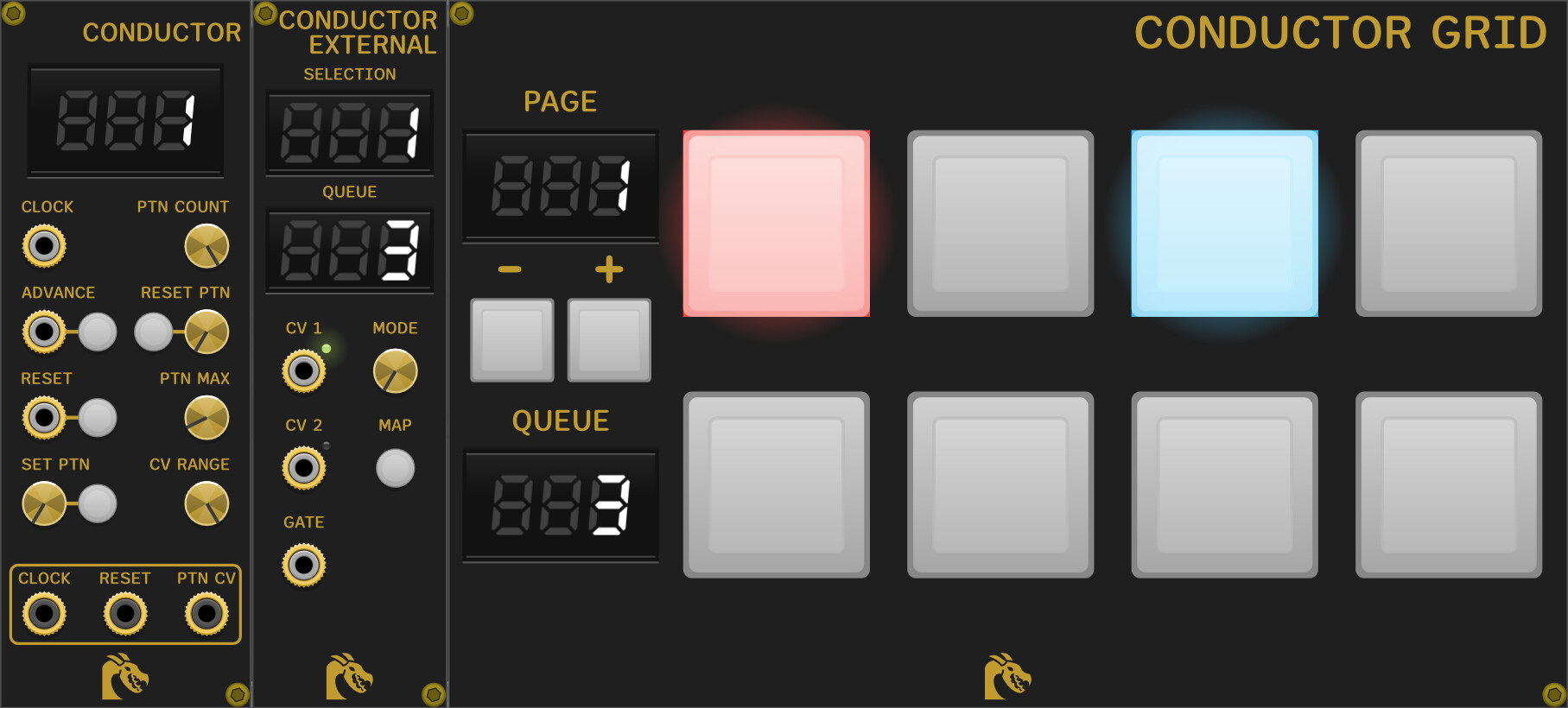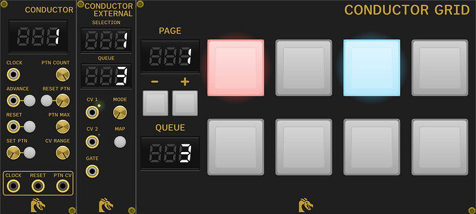 Conductor is a sequencer pattern performance controller, acting as the “core” of the module, while Conductor - External and Conductor - Grid are expanders with the actual input methods.