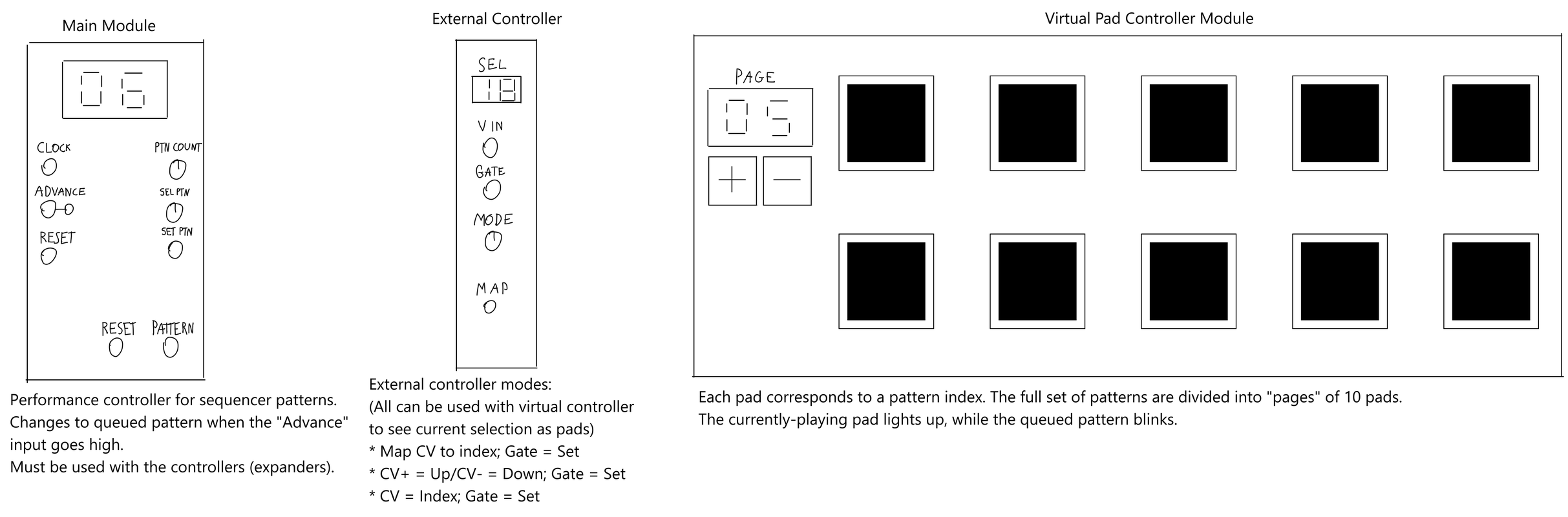 It lets you queue pattern changes to happen on an “advance” signal, with two control methods: using external controllers (e.g., MIDI) with a couple of different modes, or using a virtual pad controller.