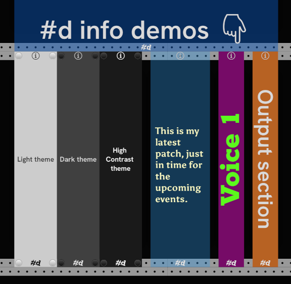 Info is now fixed in Release Nightly · Paul-Dempsey/pachde1 I’ll be updating #d One in the library soon. Info has some new options (vertical layout, margins), and there are some new oddball modules for doing unholy mods to your Rack.