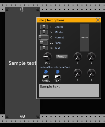 Oh, you’d like to see a module dialog, and how a dialog can be an improvement over a long cascading module menu? Here’s the Info Text options dialog: