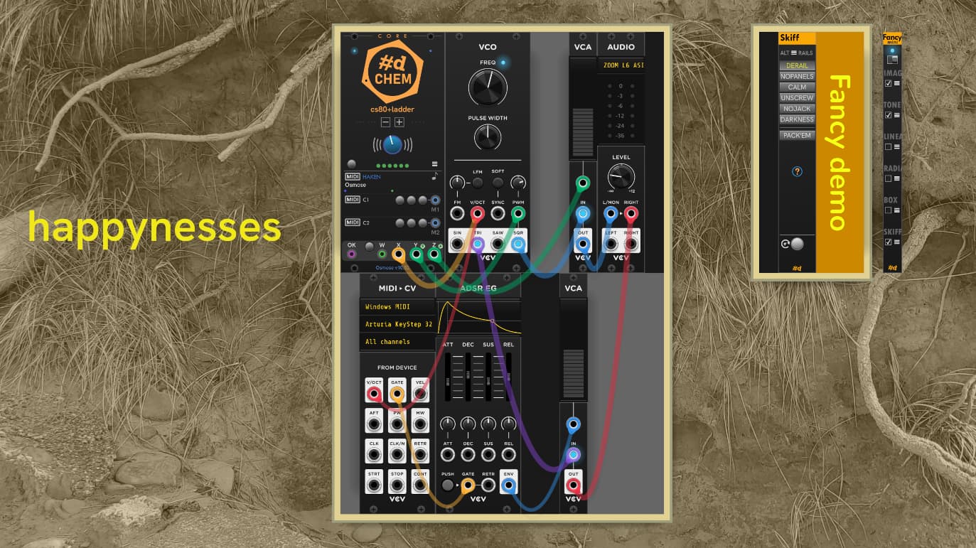 pachde1::Skiff has removed screws, enabled Calm buttons and ports, and hidden all the module panels, rendering them transparent.
