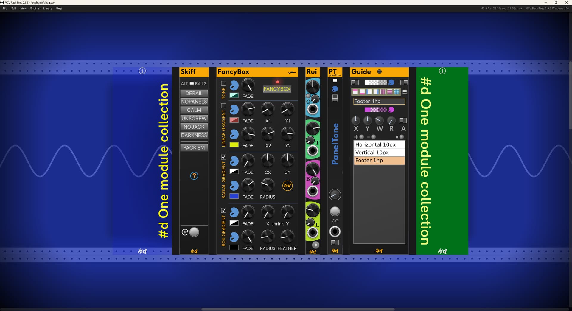 new FancyBox — Jazz up your skiff background with up to 4 layers of Fill/toning, Linear Gradient, Radial Gradient, and Box Gradient (vignetting). FancyBox has an expandable panel to show or hide the 46 CV inputs for animating the colors and parameters of the layers. You can use Fill for green-screen in OBS or video editing software.