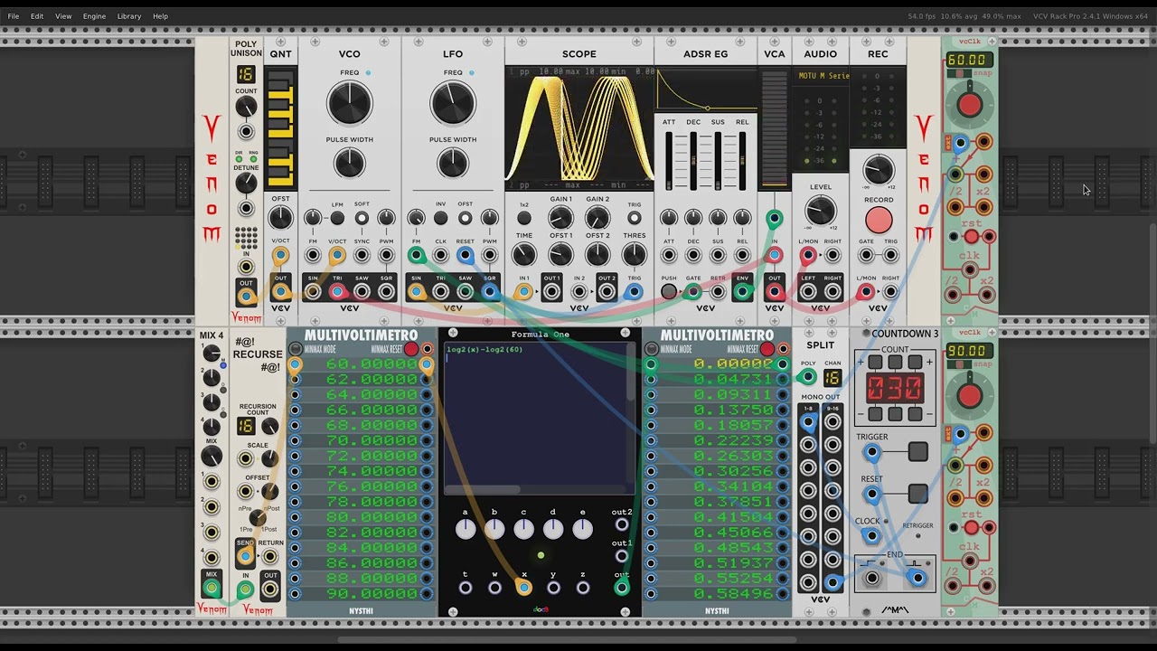 My Venom Mix 4 outputs 60 V to match, and then Recurse adds 2V (2 BPM) 15 times to get 16 voltages ranging from 60 to 90. The docB Formula One performs the Log2(x) to get the absolute voltage, and then subtracts the voltage of the baseline log2(60) to get the relative voltage needed for each LFO channel.