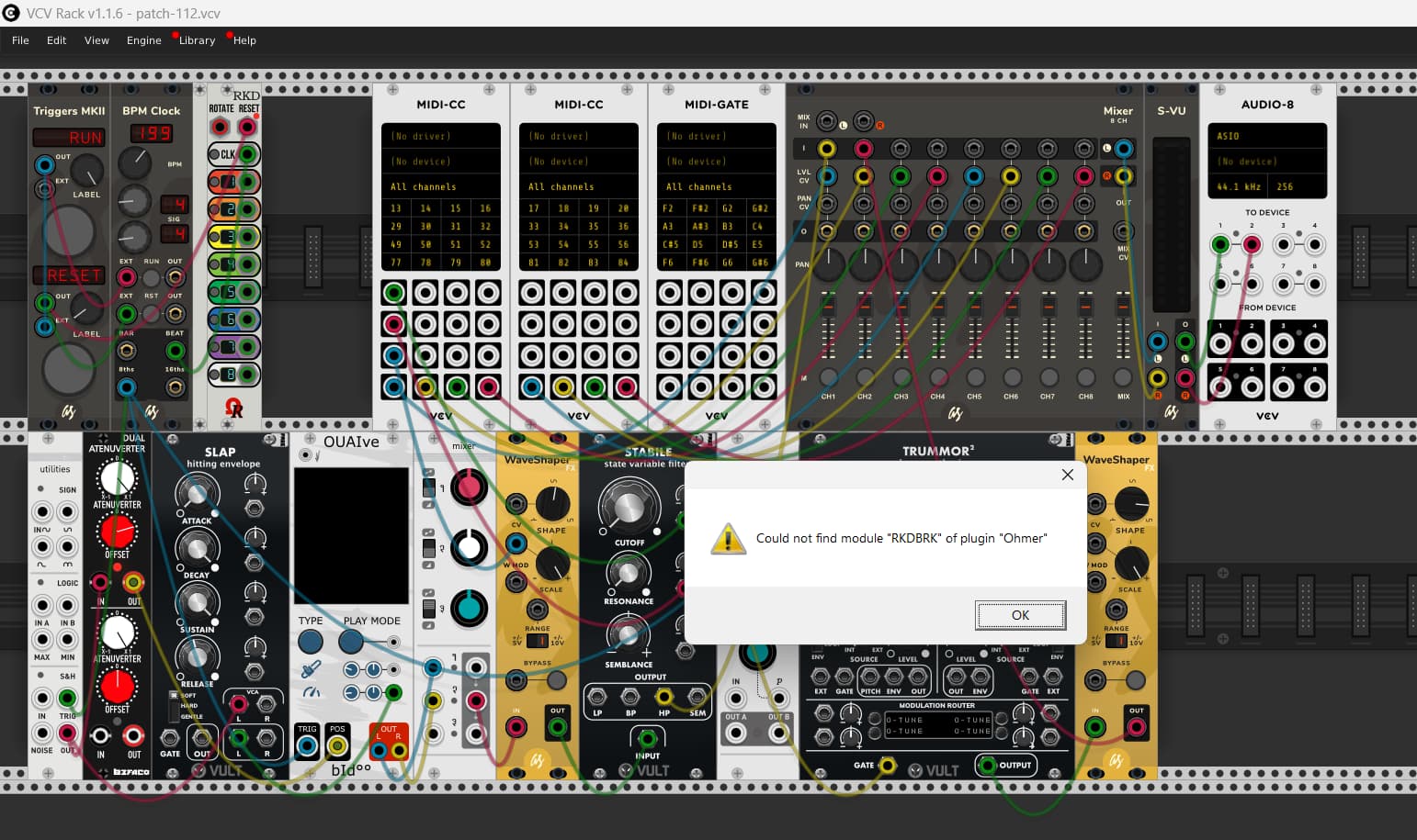The original patch above made in 0.6.0 can be opened in V2 easily except for the Ohmer RKDBRK module