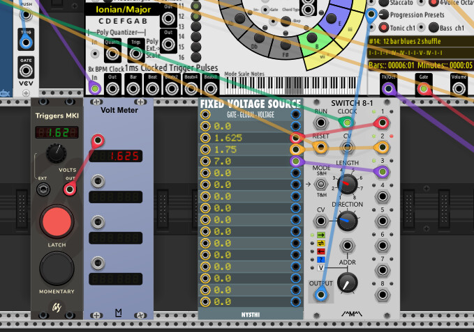 Do you ever sequence progression switches using a sequential switch and the CV eigenvalue for that progression or do you just grab random progressions with the s&h. I am probably an odd-duck when it comes to sequencing any module. I have a sheet of printer paper for each module I like to use and I manually determine the CV required to result in the parameter state. This is a tedious process but only has to be done once. For example, if I send 1.625 volts to the Meander progression type CV input, I get progression #13, “12 bar blues 1 traditional” preset but not until the current progression ends.