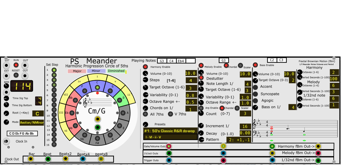 I totally redid the sequencer finite state machine, making the timings much tighter. I added multiple chords and bass notes per measure. Iāve also changed the Fractal Brownian Motion (fBm) noise to ā1/fā noise, for which the lacunarity and persistence are both fixed at 2.0 and 0.5 so users will not need to worry about that. I also added a āperiodā to the harmony, melody, 1/32nd note fBm āmeanderā, which can be adjusted by the user between 1 and 100 seconds. The controls the time period of the fundamental frequency at which the notes āmeanderā. This really improved the meander:) All changes are on my GitHub.