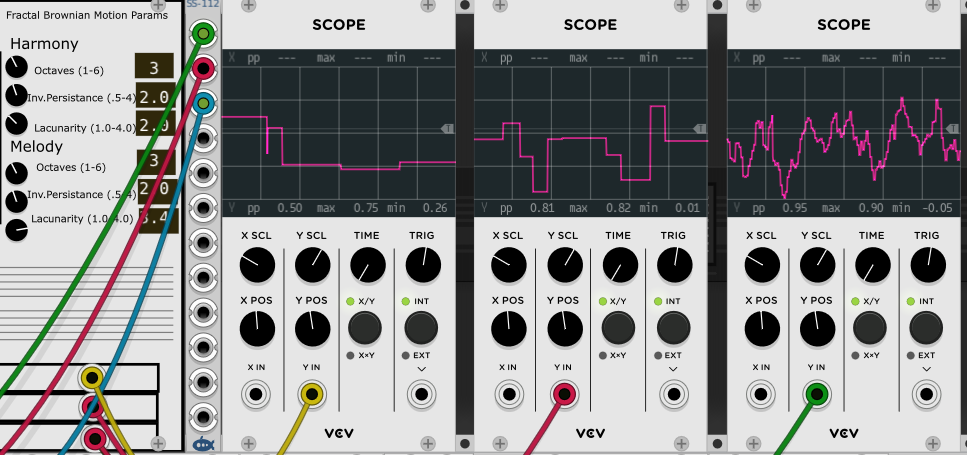 As I continue to finish up development on the alpha release of Meander, I will try to not post too much here, but I think what I added over the last couple of days will greatly expand the sequencer capabilities of the module. I have repurposed the āDroneā panel section and output ports for the āfractal Brownian motionā (fBm) parametric control for harmony and melody. fBm is fractal pseudo-random numbers (0-1.0) that has correlation over time. fBm has 3 parameters: number of octaves, inverse persistence and lacunarity as well as automatically taking the current system time as an input parameter so that the time correlation can be computed. Like all fractals, the shape of the output is similar at low and high āmagnificationsā such that there are smaller variations on top of larger variations, related to the number of octaves and the values of the other two parameters. Iām currently outputting the harmony driving fBm values out the top far bottom right output port, the melody fBm values out the middle such port and fBm calculated per 1/32 note out the bottom such port. These outputs can be used to drive other sound generators with fractal noise. The follow screen captures shows what the 3 outputs look like, for the set fBm parameters on the left: