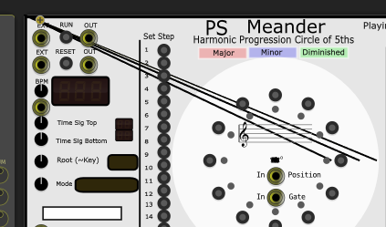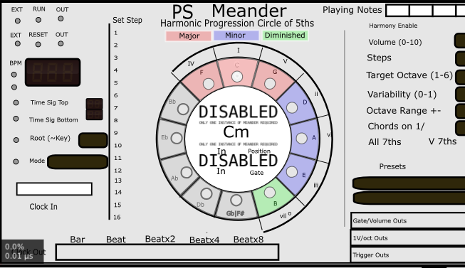 - EXT Clock In was implemented. If connected, a 1/32 note measure clock will drive the Meander sequences. If the port is disconnected, the internal clock takes over seamlessly. So, an external clock such as Clocked can send a 8X clock signal to Meander, as well as Run and Reset. All behave as expected.