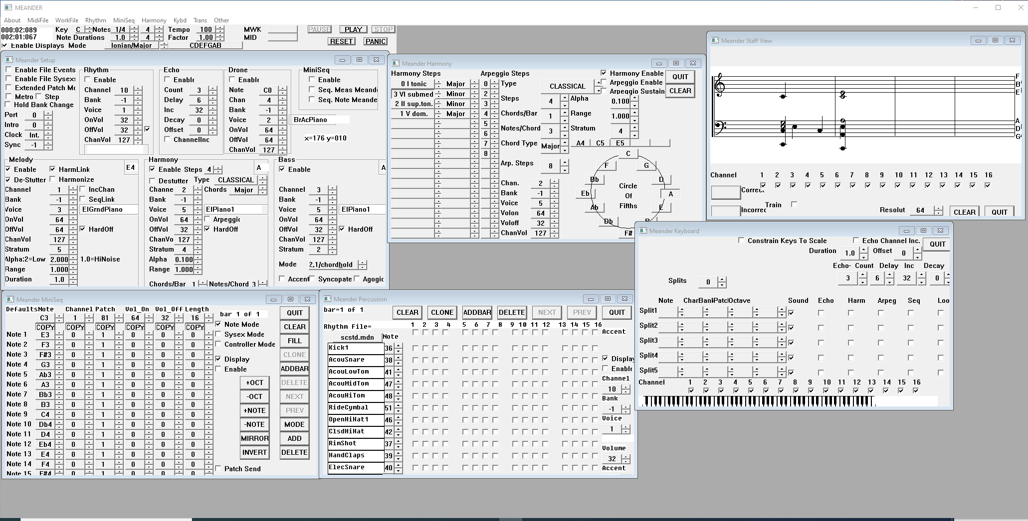 For anyone who is interested in the history of Meander for Windows, here is a screen capture of Meander with (almost) all of the windows open. I developed Meander for (DOS) Windows from 1988 until my major revision in 2001 and my last minor mod and rebuild in 2016. Meander for Windows was MIDI based, so a lot of the code had to do with MIDI. The program still works well today! This gives you some idea why Meander for Rack has so much globally scoped objects. I did a version in Ableton with Max4Live and one in Max/MSP javascript a couple of years ago, but that was less than satisfactory due to timing glitches.