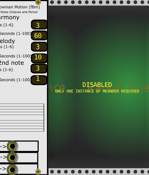 A commit was made to limit Meander to a single functional instance under Rack. This is due to large amounts of global data that can get corrupted by a 2nd instance. Now, if more instances are launched, a non-functional module displays along with a message saying it is DISABLED as only one instance of Meander is needed. Thanks to @Vortico and @contemporaryinsanity for giving me advice on how to get this working. While I was making these changes, I found that I still had a module pointer error in Meander that could cause problems even by viewing the module in the plugin manager. This was evident as the previewed instance was also launching the ModuleWidget, which it should not do (at least Meander should not since there are massive shared global memory objects). Now the preview is just the raw SVG file image, with no dynamic content, or control images.