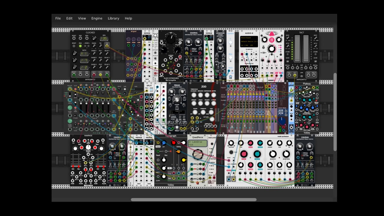 Arpeggio using Impromptu Modular’s Foundry. Bass pad using VCV Chords thru Blamsoft’s XFX Wave. String pad is Turing Machine through a trio of Squinky Labs Saws. There are a couple of Wiqid strange attractors providing modulation.
