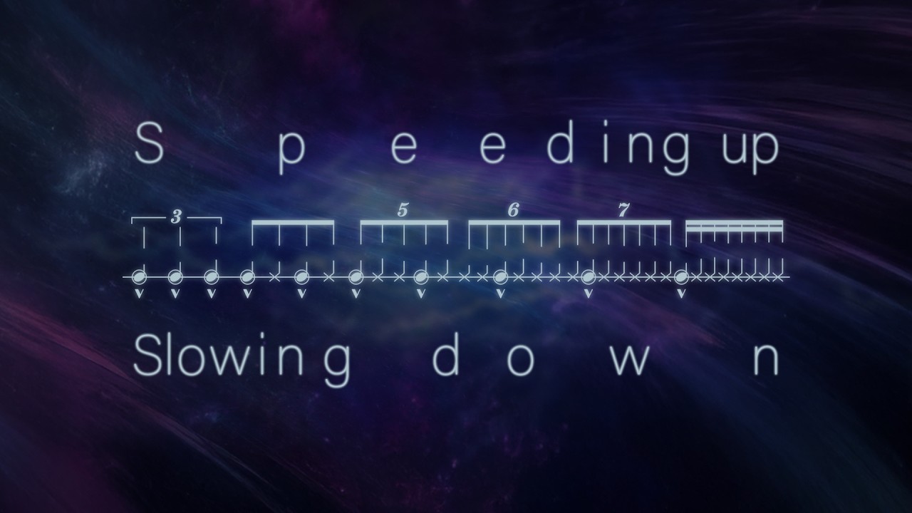 Next I tackled creating a Risset rhythm using 3 drum voices playing 1/4 (kick), 1/8 (higher tom), and 1/16 (closed hat) notes that accelerate or decelerate. The intent is for your brain to transition concentration from one voice to the next over time. Say for the accelerating case, you might here the 1/4 kick accelerating, and as it fades out and the next voice fades in, the 1/8 tom should be at the same tempo as the fading out kick. Likewise as the 1/8 fades out, it aligns with the next 1/16 fading in. It doesnāt work out exactly like that, but I still think it is effective.