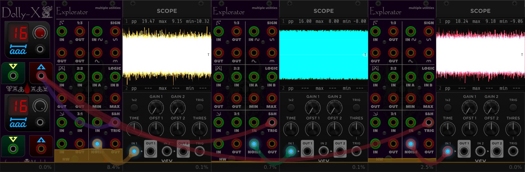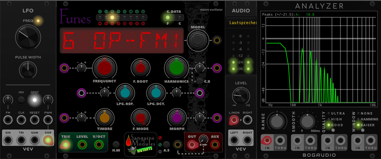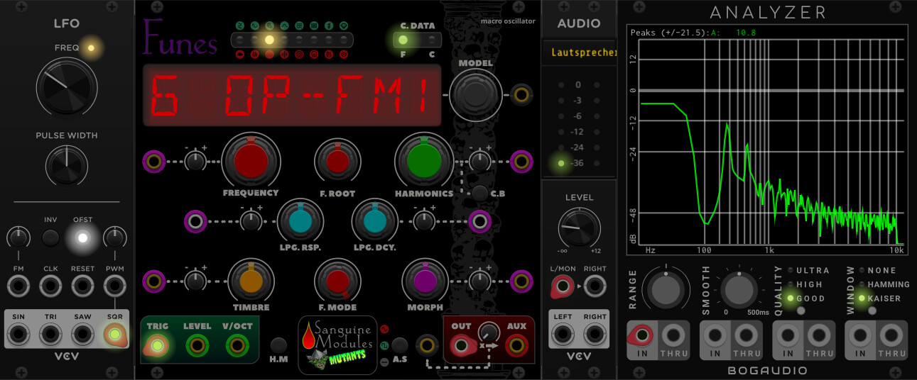 No problem, because there’s the attenuverter! By trial and error (using again the Disastrous Peace Structure and Brightness inputs) I found that I have to set the attenuverter to about 38% to get the described behaviour with a -5/+5 Volt bipolar LFO. So, with 38%, -5V input corresponds indeed to counterclockwise, +5V input to clockwise knob position. (I was assuming first, 14% (= 0.7 V / 5.0 V) should be the right attenuverter position, but testing showed, it’s too small. I guess, something with the attenuation is not as linear as I was assuming…)